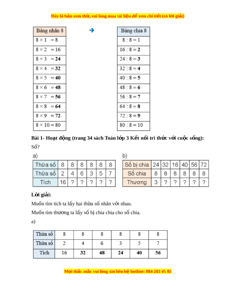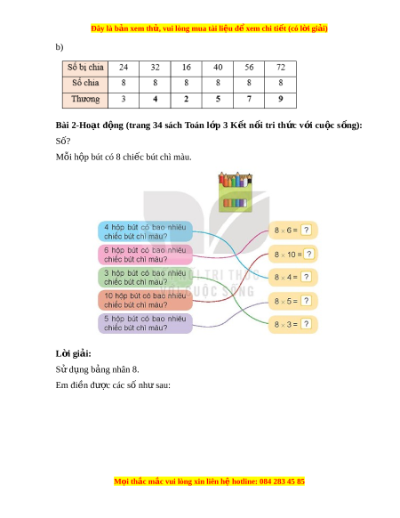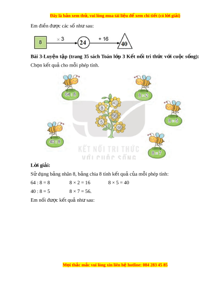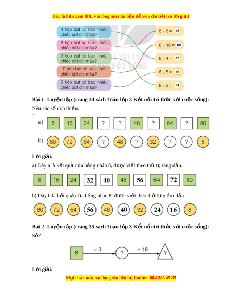 ậ (trang 34 sách Toán l p ớ 3 K t ế n i ố tri th c ứ v i ớ cu c ộ s ng) ố : Nêu các số còn thi u. ế L i ờ giải: a) Dãy a là k t ế quả c a b ủ ng ả nhân 8, đư c vi ợ t ế theo thứ t t ự ăng d n. ầ b) Dãy b là k t ế qu c ả a ủ b ng nhân 8, đ ả ư c vi ợ t ế theo th t ứ gi ự m ả d n. ầ Bài 2- Luy n ệ t p