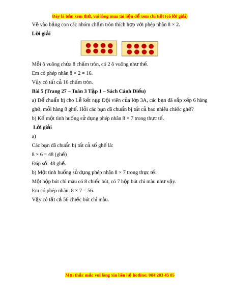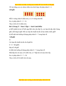 Bài 5 (Trang 27 – Toán 3 T p 1 – Sách C ậ ánh Di u ề ) a) Để chu n ẩ bị cho Lễ k t ế n p ạ Đ i ộ viên c a ủ l p ớ 3A, các b n ạ đã s p ắ x p ế 6 hàng gh , m ế i ỗ hàng 8 gh . H ế i ỏ các b n đã chu ạ n b ẩ t ị t ấ c bao nhi ả êu chi c ế gh ? ế b) Kể m t ộ tình hu ng s ố ử d ng phép nhân 8 ụ × 7 trong th c t ự . ế L i ờ giải a) Các b n đã chu ạ n b ẩ t ị t ấ c s ả gh ố l ế à: 8 × 6 = 48 (gh ) ế Đáp số: 48 gh . ế b) M t ộ tình hu ng s ố d ử ng phép ụ nhân 8 × 7 trong th c ự t : ế M t ộ h p