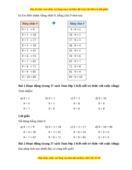 Giải Sgk Toán lớp 3 Bài 12: Bảng nhân 9, bảng chia 9 (Kết nối tri thức)
