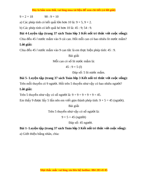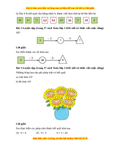 ệ tập (trang 37 sách Toán l p ớ 3-K t ế n i ố tri th c ứ v i ớ cu c ộ s ng) ố : Nh ng bông hoa nào ghi ữ phép tính có k t ế qu : ả a) L n h ớ n ơ 10? b) Bé h n 10? ơ L i ờ giải: Em th c hi ự n các ệ phép tính đư c k ợ t ế qu nh ả s ư au: 54 : 9 = 6 45 : 9 = 5 9 × 5 = 45 M i