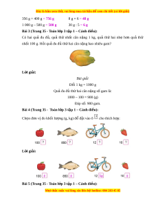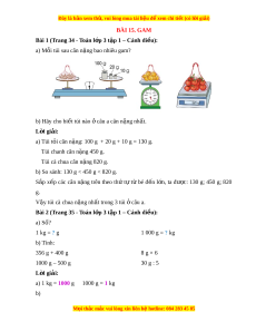 Bài 1 (Trang 34 - Toán l p 3 t ớ p 1 – C ậ ánh di u ề ): a) Mỗi túi sau cân n ng ặ bao nhiêu gam? b) Hãy cho bi t ế túi nào câu a ở cân n ng nh ặ t ấ . L i ờ giải: a) Túi t i ỏ cân n ng: ặ 100 g + 20 g + 10 g = 130 g. Túi chanh cân n ng ặ 450 g.