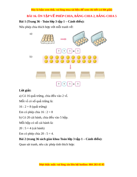 Bài 1 (Trang 36 - Toán l p 3 t ớ p 1 – C ậ ánh di u ề ): Nêu phép chia thích h p ợ v i ớ m i ỗ tranh v : ẽ L i ờ giải: a) Có 16 qu t ả r ng, chi ứ a đ u ề vào 2 v . ỉ Mỗi vỉ có số qu t ả r ng l ứ à: 16 : 2 = 8 (quả tr ng) ứ Em có phép chia 16 : 2 = 8