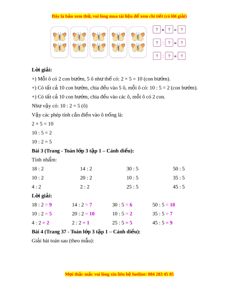 Bài 3 (Trang - Toán l p 3 t ớ p 1 – C ậ ánh di u ề ): Tính nhẩm: 18 : 2 14 : 2 30 : 5 50 : 5 10 : 2 20 : 2 10 : 5 35 : 5 4 : 2 2 : 2 25 : 5 45 : 5 L i ờ giải: 18 : 2 = 9 14 : 2 = 7 30 : 5 = 6 50 : 5 = 10 10 : 2 = 5 20 : 2 = 10 10 : 5 = 2 35 : 5 = 7 4 : 2 = 2 2 : 2 = 1 25 : 5 = 5 45 : 5 = 9