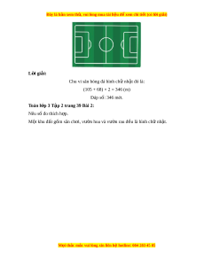Chu vi sân bóng đá hình chữ nh t ậ đó là: (105 + 68) × 2 = 346 (m) Đáp số: 346 mét. Toán l p 3 ớ T p 2 t ậ rang 39 Bài 2: Nêu số đo thích h p. ợ M t ộ khu đất gồm sân ch i ơ , vư n hoa và v ờ ư n ờ rau đ u l ề à hình ch nh ữ t ậ . M i