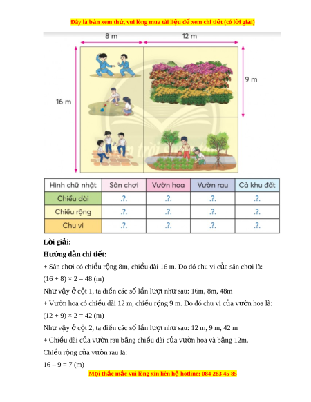 ệ đ xe ể m chi ti t (c ế ó lời gi i ả ) L i ờ giải: Hư ng ớ d n chi ẫ ti t ế : + Sân ch i ơ có chi u r ề ng 8m ộ , chi u dài ề 16 m. Do đó chu vi c a s ủ ân ch i ơ là: (16 + 8) × 2 = 48 (m) Nh v ư y ậ c ở t ộ 1, ta đi n các ề s l ố n l ầ ư t ợ nh s ư au: 16m, 8m, 48m + Vư n ờ hoa có chi u dài ề 12 m, chi u ề r ng 9 m ộ . Do đó chu vi c a ủ vư n hoa ờ là: (12 + 9) × 2 = 42 (m) Nh v ư y ậ c ở t ộ 2, ta đi n các ề s l ố n l ầ ư t ợ nh s ư au: 12 m, 9 m, 42 m + Chi u dài ề c a ủ vư n r ờ au b ng chi ằ u ề dài c a v ủ ư n ờ hoa và b ng ằ 12m. Chi u r ề ng c ộ a ủ vư n r ờ au là: 16 – 9 = 7 (m) M i