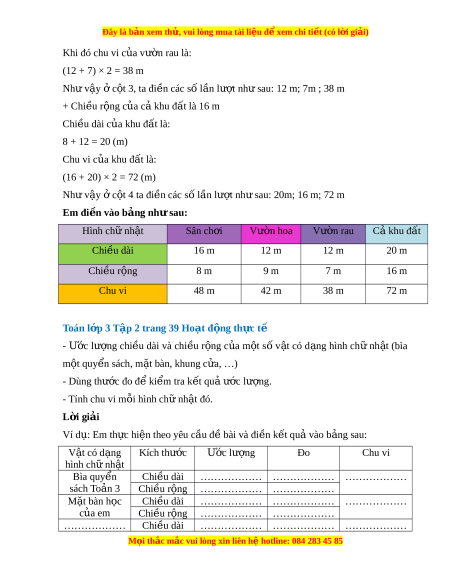 ổi 1 m = 100 cm. Khi đó chu vi c a ủ hình ch nh ữ t ậ là: (225 + 100) × 2 = 650 (cm) V y t ậ a cần đi n s ề ố 650 vào ô trống c ở t ộ 3 * Ta đi n nh ề s ư au: Chi u ề dài hình ch nh ữ t ậ 27 cm 52 m 225 cm Chi u ề r ng hì ộ nh chữ nh t ậ 12 cm 34 m 1 m Chu vi hình ch nh ữ t ậ 78 cm 172 m 650 cm Toán l p 3 ớ T p 2 t ậ rang 38 Bài 2: M i