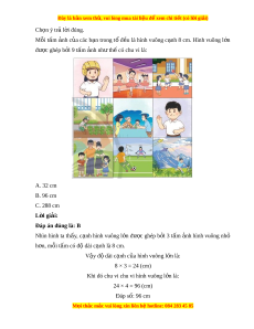 ệ đ xe ể m chi ti t (c ế ó lời gi i ả ) Ch n ý t ọ r l ả i ờ đúng. Mỗi t m ấ nh ả c a ủ các b n ạ trong t ổ đ u ề là hình vuông c nh ạ 8 cm. Hình vuông l n ớ đư c ghép ợ b i ở 9 t m ấ nh ả nh t ư h có chu vi ế là: A. 32 cm B. 96 cm C. 288 cm L i ờ giải: Đáp án đúng là: B Nhìn hình ta th y ấ , c nh ạ hình vuông l n ớ đư c ợ ghép b i ở 3 t m ấ nh ả hình vuông nhỏ h n, m ơ