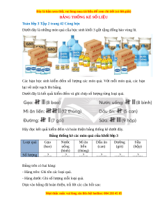 ệ đ xe ể m chi ti t (c ế ó lời gi i ả ) BẢNG TH N Ố G KÊ S L Ố I U Ệ Toán l p 3 ớ T p 2 t ậ rang 42 Cùng h c ọ Dư i ớ đây là nh ng ữ món quà c a h ủ c ọ sinh kh i ố 3 g i ử t ng đ ặ ng bào vùng l ồ ũ. Các b n ạ h c ọ sinh ki m ể đ m ế số lư ng ợ các món quà. V i ớ m i ỗ món quà, các b n ạ l i ạ vẽ m t ộ v ch ạ lên b ng. ả Dư i ớ đây là k t ế qu ki ả m ể đ m ế và ghi chép s l ố ư ng t ợ ng l ừ o i ạ quà. Hãy đ c k ọ t ế qu ki ả m ể đ m ế và hoàn thi n b ệ ng ả th ng kê d ố ư i ớ đây. Bảng th ng kê các ố món quà c a k ủ h i ố l p 3 ớ Lo i ạ quà G o ạ Nư c ớ Mì ăn Dầu ăn Đư ng ờ S a ữ (bao) uống li n ề (can) (gói) (h p) ộ (bình) (thùng) Số lư ng ợ …?... …?... …?.... ….?..... ….?.... ….?.... B ng ả trên có hai hàng: