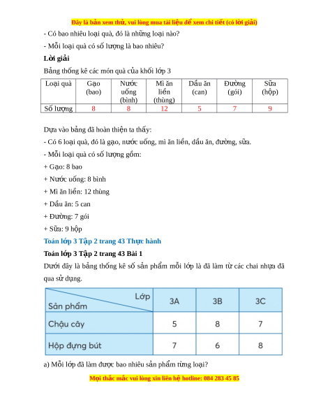 ả thống kê các món quà c a ủ kh i ố l p 3 ớ Lo i ạ quà G o ạ Nư c ớ Mì ăn Dầu ăn Đư ng ờ S a ữ (bao) uống li n ề (can) (gói) (h p) ộ (bình) (thùng) Số lư ng ợ 8 8 12 5 7 9 D a vào b ự ng ả đã hoàn thi n t ệ a th y: ấ - Có 6 lo i ạ quà, đó là g o, ạ nư c u ớ ng, m ố ì ăn li n, d ề u ăn, đ ầ ư ng, s ờ a. ữ - Mỗi lo i ạ quà có số lư ng ợ g m ồ : + G o: ạ 8 bao + Nư c u ớ ống: 8 bình + Mì ăn li n: ề 12 thùng + Dầu ăn: 5 can + Đư ng: ờ 7 gói + S a: ữ 9 h p ộ Toán l p 3 ớ T p 2 t ậ rang 43 Th c hành ự Toán l p 3 ớ T p 2 t ậ rang 43 Bài 1 Dư i ớ đây là b ng ả th ng ố kê số s n ả ph m ẩ m i ỗ l p