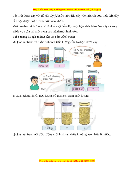 a) Quan sát tranh và nh n xét ậ cách ư c l ớ ư ng ợ c a hai ủ b n ạ dư i ớ đây: b) Quan sát tranh r i ồ ư c l ớ ư ng s ợ ố gam sen trong m i ỗ lo sau: c) Quan sát tranh r i ồ ước lư ng m ợ i ỗ bình sau ch a ư kho ng bao ả nhiêu lít nư c: ớ
