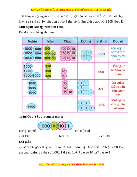 ộ nghìn không trăm linh năm. Em đi n vào b ề ng ả nh s ư au: Toán l p 3 ớ T p 2 t ậ rang 11 Bài 2: Dùng các thẻ th hi ể n s ệ ố. a) 8 137 b) 9 054 c) 5 208 L i ờ giải: a) Số 8 137 g m ồ 8 nghìn, 1 trăm, 3 ch c, ụ 7 đ n ơ v .ị Do đó đ ể th ể hi n ệ s ố 8 137, em cần s d ử ng ụ 8 th s ẻ ố 1 000, 1 th s ẻ 100, 3 t ố h s ẻ 10 và ố 7 th s ẻ 1 ố M i