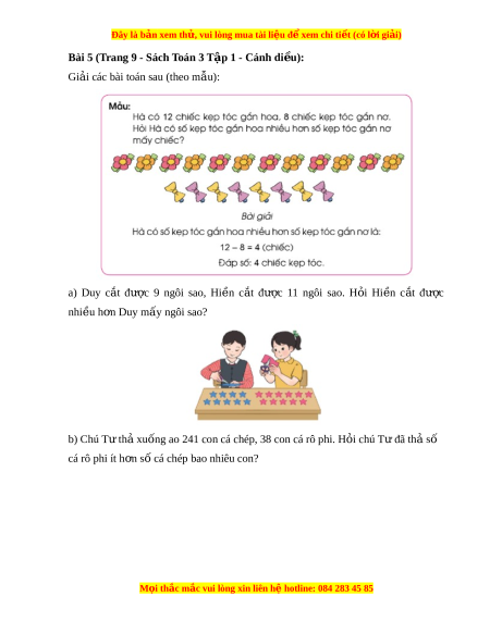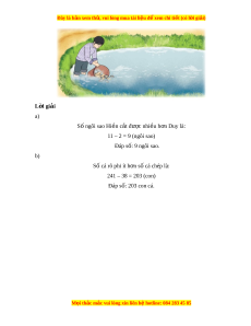 ệ đ xe ể m chi ti t (c ế ó lời gi i ả ) L i ờ giải a) Số ngôi sao Hi n ề c t ắ đư c ợ nhi u h ề n D ơ uy là: 11 – 2 = 9 (ngôi sao) Đáp số: 9 ngôi sao. b) Số cá rô phi ít h n ơ s cá chép ố là: 241 – 38 = 203 (con) Đáp số: 203 con cá. M i