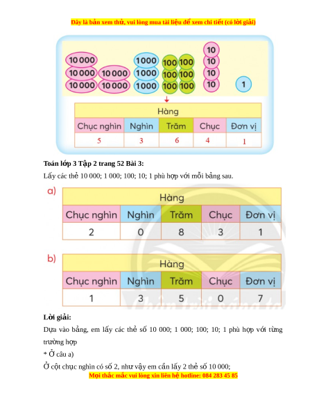 ệ đ xe ể m chi ti t (c ế ó lời gi i ả ) Toán l p 3 ớ T p 2 t ậ rang 52 Bài 3: Lấy các th 10 000; ẻ 1 000; 100; 10; 1 phù h p v ợ i ớ m i ỗ b ng s ả au. L i ờ giải: D a ự vào b ng, ả em l y