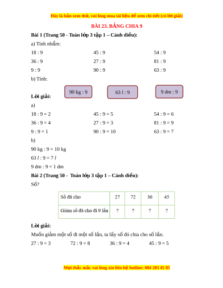 ệ đ xe ể m chi ti t (c ế ó lời gi i ả ) BÀI 23. BẢNG CHIA 9