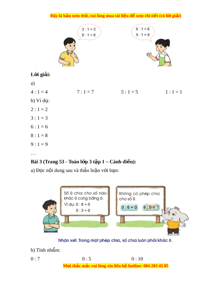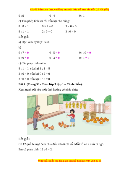 ệ đ xe ể m chi ti t (c ế ó lời gi i ả ) 0 : 9 0 : 4 0 : 1 c) Tìm phép tính sai r i ồ s a ử l i ạ cho đúng: 8 : 8 = 1 0 × 2 = 0 3 × 0 = 0 8 : 1 = 1 2 : 0 = 0 3 : 0 = 0 L i ờ giải a) H c s ọ inh tự th c ự hành. b) 0 : 7 = 0 0 : 5 = 0 0 : 10 = 0 0 : 9 = 0 0 : 4 = 0 0 : 1 = 0 c) Các phép tính sai là: 8 : 1 = 1, s a l ử i ạ 8 : 1 = 8 2 : 0 = 0, s a l ử i ạ 0 : 2 = 0 3 : 0 = 0, s a l ử i ạ 0 : 3 = 0