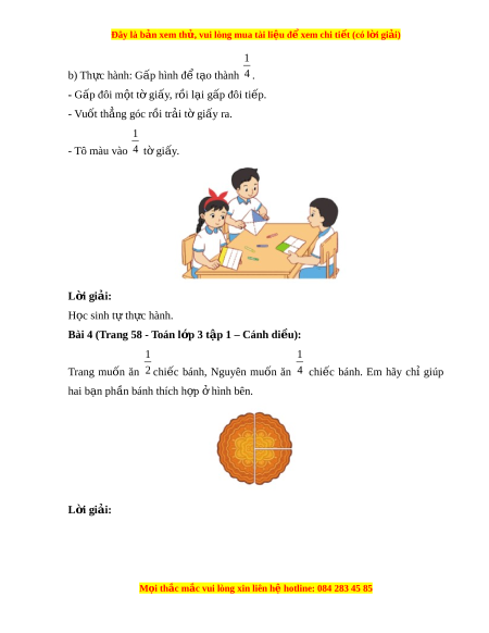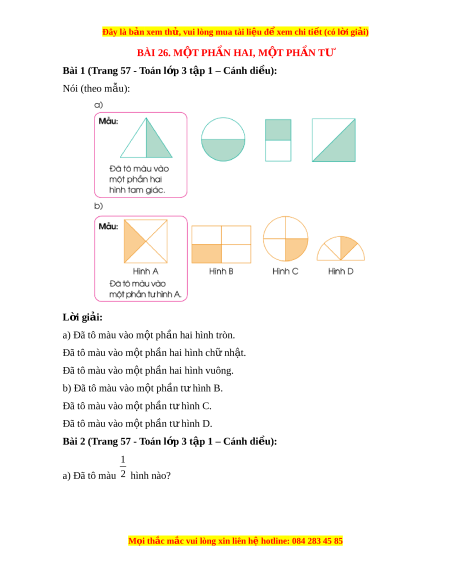 Giải Sgk Toán lớp 3 Bài 26: Một phần hai, một phần tư (Cánh diều)