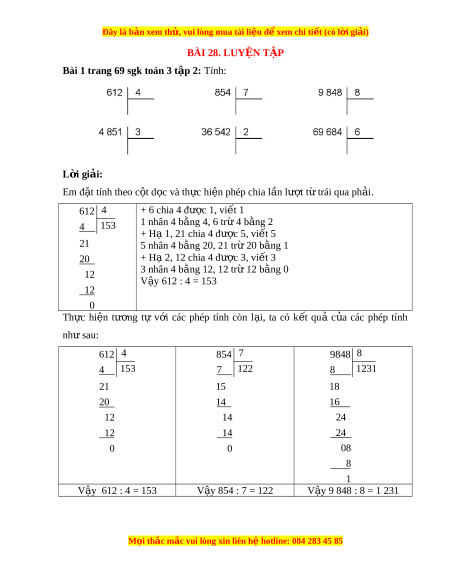 Bài 1 trang 69 sgk toán 3 t p 2 ậ : Tính: L i ờ giải: Em đ t ặ tính theo c t ộ d c và t ọ h c ự hi n phép ệ chia l n l ầ ư t ợ t t ừ rái qua ph i ả . 612 4 + 6 chia 4 đư c ợ 1, vi t ế 1 4 153 1 nhân 4 b ng 4, 6 t ằ r 4 b ừ ng ằ 2 + H 1, 21 chi ạ a 4 đư c 5, vi ợ t ế 5 21 5 nhân 4 b ng 20, 21 t ằ r 20 b ừ ng ằ 1 20 + H 2, 12 chi ạ a 4 đư c 3, vi ợ t ế 3 12 3 nhân 4 b ng 12, 12 t ằ r 12 b ừ ng ằ 0 V y 612 : ậ 4 = 153 12 0 Th c ự hi n ệ tư ng ơ tự v i ớ các phép tính còn l i ạ , ta có k t ế quả c a ủ các phép tính nh s ư au: 612 4 854 7 9848 8 4 153 7 122 8 1231 21 15 18 20 14 16 12 14 24 12 14 24 0 0 08 8 1 V y 612 : ậ 4 = 153 V y 854 : ậ 7 = 122 V y 9 848 : ậ 8 = 1 231 M i