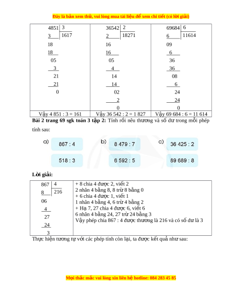 Bài 2 trang 69 sgk toán 3 t p ậ 2: Tính r i ồ nêu thư ng ơ và số dư trong m i ỗ phép tính sau: L i ờ giải: 867 4 + 8 chia 4 đư c ợ 2, vi t ế 2 8 216 2 nhân 4 b ng 8, 8 t ằ r 8 b ừ ng ằ 0 + 6 chia 4 đư c ợ 1, vi t ế 1 06 1 nhân 4 b ng 4, 6 t ằ r 4 b ừ ng ằ 2 4 + H 7, 27 chi ạ a 4 đư c 6, vi ợ t ế 6 27 6 nhân 4 b ng 24, 27 t ằ r 24 b ừ ng ằ 3 V y phép ậ chia 867 : 4 đư c t ợ hư ng ơ là 216 và có s d ố l ư à 3 24 3 Th c ự hi n t ệ ư ng ơ t v ự i ớ các phép tính còn l i ạ , ta đư c ợ k t ế qu nh ả s ư au: M i
