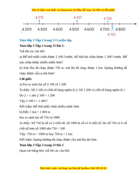 ệ đ xe ể m chi ti t (c ế ó lời gi i ả ) Toán l p 3 ớ T p 2 t ậ rang 13 Luy n ệ t p ậ Toán l p 3 ớ T p 2 t ậ rang 13 Bài 1: Tr l ả i ờ các câu h i ỏ : a) Bể thứ nh t ấ ch a ứ đư c ợ 2 100 l nư c, ớ bể thứ hai ch a ứ đư c ợ 1 200 l nư c. ớ Bể nào ch a đ ứ ược nhi u n ề ư c ớ h n? ơ b) Anh Hai đã ch y ạ đư c ợ 750 m, anh Ba đã ch y ạ đư c ợ 1 km. Quãng đư ng ờ đã ch y đ ạ ược c a ủ ai dài h n? ơ L i ờ giải: