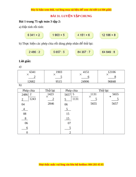 phép chia rồi dùng phép nhân đ t ể h l ử i ạ : L i ờ giải: a) 6341 1903 4151 12106 2 5 6 8 12682 9515 24906 96848 b) Phép chia Th l ử i ạ Phép chia Th l ử i ạ 2486 2 1423 5657 5 1131 5655 2 1243 2 5 1131 5 5 04 2846 06 5655 5657 4 5 08 15 8 15 06 07 6 5 0 2 M i