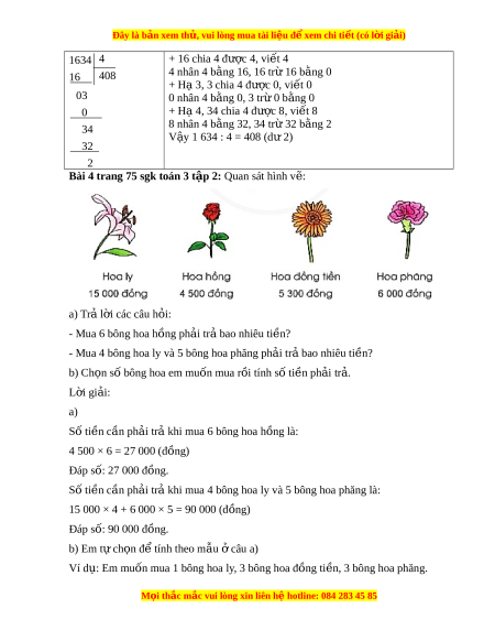 Bài 4 trang 75 sgk toán 3 t p 2 ậ : Quan sát hình v : ẽ a) Tr l ả i ờ các câu h i ỏ : - Mua 6 bông hoa hồng ph i ả tr bao nhi ả êu ti n? ề
