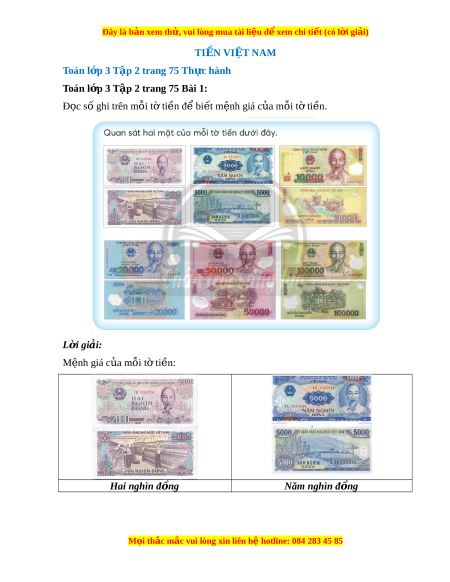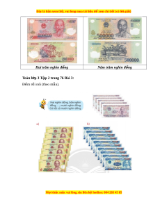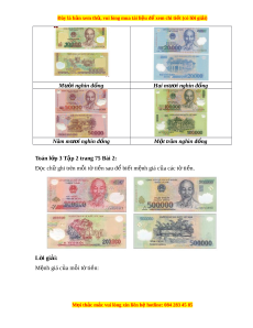ệ đ xe ể m chi ti t (c ế ó lời gi i ả ) TIỀN VIỆT NAM Toán l p 3 ớ T p 2 t ậ rang 75 Th c hành ự Toán l p 3 ớ T p 2 t ậ rang 75 Bài 1: Đ c s ọ ố ghi trên m i ỗ t t ờ i n đ ề bi ể t ế m nh gi ệ á c a m ủ i ỗ t t ờ i n. ề L i ờ giải: Mệnh giá c a ủ mỗi t t ờ i n: ề Hai nghìn đ ng ồ