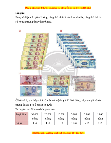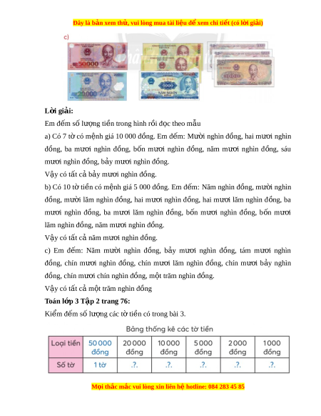 ệ đ xe ể m chi ti t (c ế ó lời gi i ả ) L i ờ giải: Em đ m ế số lư ng ợ ti n t ề rong hình r i ồ đ c ọ theo m u ẫ a) Có 7 t ờ có m nh ệ giá 10 000 đ ng. ồ Em đ m ế : Mư i ờ nghìn đ ng, ồ hai mư i ơ nghìn đồng, ba mư i ơ nghìn đ ng, ồ b n ố mư i ơ nghìn đ ng, ồ năm mư i ơ nghìn đ ng, ồ sáu mư i ơ nghìn đồng, b y m ả ư i ơ nghìn đ ng. ồ V y có ậ tất cả b y m ả ư i ơ nghìn đ ng. ồ b) Có 10 t ờ ti n ề có m nh ệ giá 5 000 đ ng. ồ Em đ m ế : Năm nghìn đ ng, ồ mư i ờ nghìn đồng, mư i ờ lăm nghìn đ ng, ồ hai mư i ơ nghìn đ ng, ồ hai mư i ơ lăm nghìn đ ng, ồ ba mư i ơ nghìn đ ng, ồ ba mư i ơ lăm nghìn đ ng, ồ b n ố mư i ơ nghìn đ ng, ồ b n ố mư i ơ