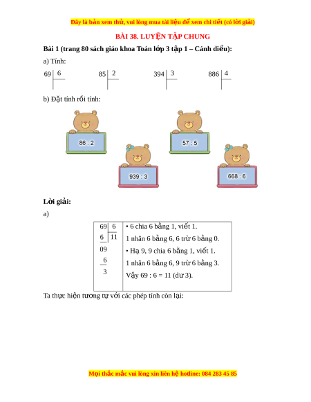 Bài 1 (trang 80 sách giáo khoa Toán l p 3 t ớ p 1 – C ậ ánh di u) ề : a) Tính: 69 6 85 2 394 3 886 4 b) Đ t ặ tính rồi tính: L i ờ giải: a) 69 6 • 6 chia 6 b ng 1, vi ằ t ế 1. 6 11 1 nhân 6 b ng ằ 6, 6 trừ 6 b ng 0. ằ 09 • Hạ 9, 9 chia 6 b ng ằ 1, vi t ế 1. 6 1 nhân 6 b ng ằ 6, 9 trừ 6 b ng 3. ằ 3 V y ậ 69 : 6 = 11 (d 3) ư . Ta th c hi ự ện tư ng t ơ v ự i ớ các phép tính còn l i ạ : M i