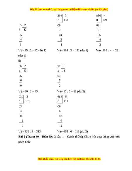 ệ đ xe ể m chi ti t (c ế ó lời gi i ả ) 394 3 886 4 3 131 8 221 85 2 09 08 8 42 9 8 05 04 06 4 3 4 1 1 2 V y 85 : ậ 2 = 42 (d 1) ư V y 394 : ậ 3 = 131 (d 1) ư V y ậ 886 : 4 = 221 (dư 2) b) 86 2 57 5 8 43 5 11 06 07 6 5 0 2 V y 86 : ậ 2 = 43. V y 57 : ậ 5 = 11 (d 2 ư ). 939 3 668 6 9 313 6 111 03 06 3 6 09 08 9 6 0 2 V y 939 : ậ 3 = 313. V y 668 : ậ 6 = 111 (dư 2).
