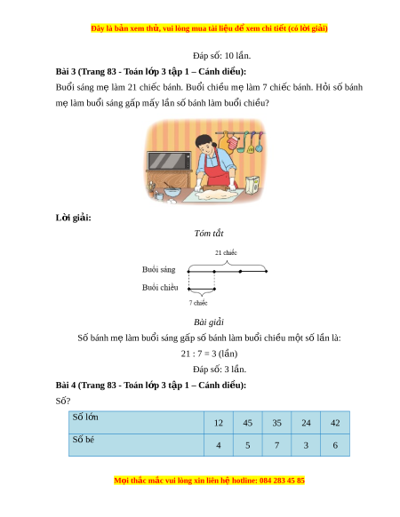 Buổi sáng mẹ làm 21 chi c ế bánh. Bu i ổ chi u ề m ẹ làm 7 chi c ế bánh. H i ỏ s ố bánh mẹ làm buổi sáng g p m ấ y l ấ n s ầ bánh l ố àm bu i ổ chi u? ề L i ờ giải: Tóm t t ắ Bài gi i ả Số bánh m l ẹ àm bu i ổ sáng g p s ấ ố bánh làm bu i ổ chi u m ề t ộ số l n l ầ à: 21 : 7 = 3 (l n ầ ) Đáp số: 3 l n. ầ