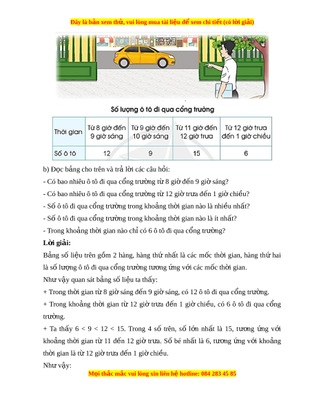 - Số ô tô đi qua cổng trư ng ờ trong kho ng ả th i ờ gian nào là ít nh t ấ ? - Trong kho ng ả th i ờ gian nào ch có 6 ô t ỉ ô đi qua c ng t ổ rư ng? ờ L i ờ giải: B ng ả số li u ệ trên g m ồ 2 hàng, hàng thứ nh t ấ là các m c ố th i ờ gian, hàng th ứ hai là số lư ng ô t ợ ô đi qua c ng t ổ rư ng t ờ ư ng ơ ng ứ v i ớ các m c t ố h i ờ gian. Nh v ư y ậ quan sát b ng ả s l ố i u t ệ a th y: ấ + Trong th i ờ gian t 8 gi ừ s ờ áng đ n ế 9 gi s