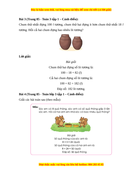 Bài 3 (Trang 85 - Toán 3 t p 1 – C ậ ánh di u ề ): Chum thứ nh t ấ đ ng ự 100 l tư ng, ơ chum thứ hai đ ng ự ít h n ơ chum thứ nh t ấ 18 l tư ng. H ơ i ỏ c hai ả chum đ ng bao ự nhiêu lít tư ng? ơ L i ờ giải: Bài gi i ả Chum th hai ứ đ ng s ự ố lít tư ng l ơ à: 100 – 18 = 82 (l) Cả hai chum đ ng s ự ố lít tư ng l ơ à: 100 + 82 = 182 (l) Đáp số: 182 lít tư ng. ơ