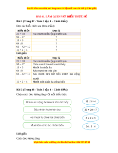Bài 1 (Trang 87 - Toán 3 t p 1 – C ậ ánh di u ề ): Đ c các ọ bi u t ể h c s ứ au (theo m u) ẫ : Bi u ể th c ứ Đ c ọ là 21 + 18 Hai mư i ơ mốt c ng m ộ ư i ờ tám 95 – 17 ? 13 × 3 ? 64 : 8 ? 65 – 42 + 10 ? 11 × 3 + 4 ? L i ờ giải: Bi u ể th c ứ Đ c ọ là 21 + 18 Hai mư i ơ mốt c ng m ộ ư i ờ tám 95 – 17 Chín mư i ơ lăm tr m ừ ư i ờ b y ả 13 × 3 Mư i ờ ba nhân ba 64 : 8 Sáu mư i ơ t chi ư a tám 65 – 42 + 10 Sáu mư i ơ lăm trừ b n ố mư i ơ hai c ng ộ mư i ờ 11 × 3 + 4 Mư i ờ m t ộ nhân ba c ng b ộ ốn