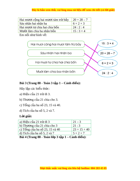Bài 3 (Trang 88 - Toán 3 t p 1 – C ậ ánh di u ề ): Hãy l p các ậ bi u t ể h c: ứ a) Hi u c ệ a ủ 21 trừ đi 3. b) Thư ng ơ c a 21 chi ủ a cho 3. c) T ng c ổ a ủ ba số 23, 15 và 40. d) Tích c a ủ ba số 5, 2 và 7. L i ờ giải: a) Hi u c ệ a ủ 21 trừ đi 3 21 – 3 b) Thư ng ơ c a 21 chi ủ a cho 3 21 : 3 c) T ng c ổ a ủ ba số 23, 15 và 40 23 + 15 + 40 d) Tích c a ủ ba số 5, 2 và 7 5 × 2 × 7