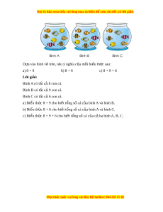 nh vẽ trên, nêu ý nghĩa c a ủ mỗi bi u t ể h c s ứ au: a) 8 + 9 b) 8 + 6 c) 8 + 9 + 6 L i ờ giải: Bình A có tất c 8 con cá. ả Bình B có t t ấ cả 9 con cá. Bình C có t t ấ cả 6 con cá. a) Bi u t ể h c 8 + 9 cho bi ứ t ế tổng số cá c a ủ bình A và bình B. b) Bi u ể th c 8 + 6 cho bi ứ t ế t ng s ổ cá c ố a ủ bình A và bình C. c) Bi u t ể h c 8 + 9 + 6 cho bi ứ t ế t ng s ổ cá c ố a ủ c ba bì ả nh A, B, C. M i