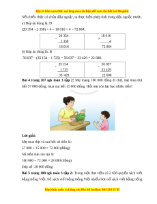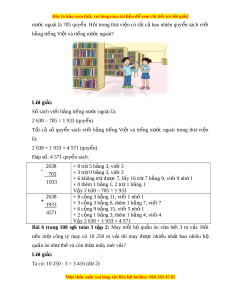 ệ đ xe ể m chi ti t (c ế ó lời gi i ả ) nư c ớ ngoài là 705 quy n. ể H i ỏ trong th ư vi n ệ có t t ấ c ả bao nhiêu quy n ể sách vi t ế b ng t ằ i ng ế Vi t ệ và ti ng n ế ư c ớ ngoài? L i ờ giải: Số sách vi t ế b ng ằ ti ng ế nư c ngoài ớ là: 2 638 – 705 = 1 933 (quy n) ể Tất cả số quy n ể sách vi t ế b ng ằ ti ng ế Vi t ệ và ti ng ế nư c ớ ngoài trong thư vi n ệ là: 2 638 + 1 933 = 4 571 (quy n) ể Đáp số: 4 571 quy n s ể ách. 2638 + 8 tr 5 b ừ ng ằ 3, vi t ế 3 705 + 3 tr 0 b ừ ng ằ 3, vi t ế 3 + 6 không tr đ ừ ư c ợ 7, l y 16 t ấ r 7 b ừ ng ằ 9, vi t ế 9 nh 1 ớ 1933 + 0 thêm 1 b ng 1, 2 t ằ r 1 b ừ ng 1 ằ V y 2 638 – 705 = 1 933 ậ 2638 + 8 c ng 3 b ộ ng ằ 11, vi t ế 1 nhớ 1 1933 + 3 c ng 3 b ộ ng ằ 6, thêm 1 b ng 7, vi ằ t ế 7 + 6 c ng 9 b ộ ng ằ 15, vi t ế 5 nh 1 ớ 4571 + 2 c ng 1 b ộ ng ằ 3, thêm 1 b ng 4, vi ằ t ế 4 V y 2 638 + 1 933 = 4 571 ậ