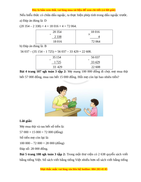 Bài 4 trang 107 sgk toán 3 t p 2: ậ M mang 100 000 đ ng đi ch , m mua th tẹ ồ ợ ẹ ị