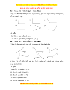 ế góc nào là góc vuông, góc nào là góc không vuông trong các hình trên. L i ờ giải: a) Góc đỉnh B, c nh ạ BA và BC. Góc đỉnh E, c nh ạ ED và EG. Góc đỉnh P, c nh ạ PO và PQ. Góc đỉnh I, c nh I ạ H và IK. Góc đỉnh M, c nh ạ ML và MN. M i