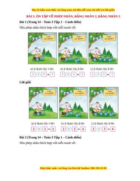 Bài 1 (Trang 14 – Toán 3 T p 1 – C ậ ánh di u) ề Nêu phép nhân thích h p ợ v i ớ m i ỗ tranh v : ẽ L i ờ giải