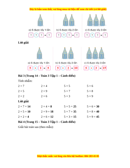 Bài 3 (Trang 14 – Toán 3 T p 1 – C ậ ánh di u) ề Tính nhẩm: 2 × 7 2 × 4 5 × 5 5 × 6 2 × 5 2 × 9 5 × 7 5 × 8 2 × 2 2 × 6 5 × 3 5 × 9 L i ờ giải 2 × 7 = 14 2 × 4 = 8 5 × 5 = 25 5 × 6 = 30 2 × 5 = 10 2 × 9 = 18 5 × 7 = 35 5 × 8 = 40 2 × 2 = 4 2 × 6 = 12 5 × 3 = 15 5 × 9 = 45