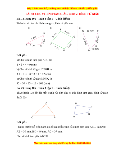 Giải Sgk Toán lớp 3 Bài 50: Chu vi hình tam giác. Chu vi hình tứ giác (Cánh diều)