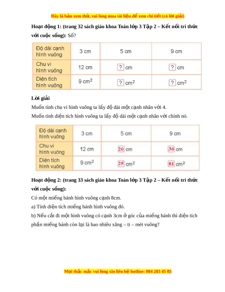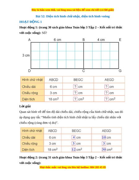 Giải Sgk Toán lớp 3 Bài 52: Diện tích hình chữ nhật, diện tích hình vuông (Kết nối tri thức)