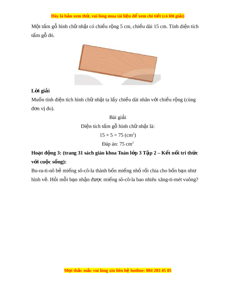 ệ đ xe ể m chi ti t (c ế ó lời gi i ả ) M t ộ tấm gỗ hình ch nh ữ t ậ có chi u r ề ng 5 cm ộ , chi u dài ề 15 cm. Tính di n t ệ ích tấm gỗ đó. L i ờ giải Muốn tính di n t ệ ích hình chữ nh t ậ ta l y chi ấ u dài ề nhân v i ớ chi u r ề ng ( ộ cùng đ n v ơ ị đo). Bài gi i ả Di n t ệ ích t m ấ g hì ỗ nh ch nh ữ t ậ là: 15 × 5 = 75 (cm2) Đáp án: 75 cm2 Hoạt đ ng 3: ộ