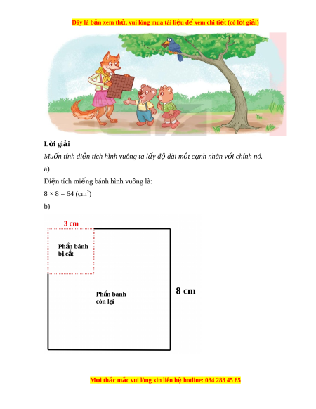 (trang 33 sách giáo khoa Toán l p 3 ớ T p 2 – K ậ t ế n i ố tri th c ứ v i ớ cu c ộ s ng) ố : Có m t ộ mi ng bánh hì ế nh vuông c nh 8cm ạ . a) Tính di n t ệ ích mi ng bánh hì ế nh vuông đó. b) N u ế c t ắ đi m t ộ hình vuông có c nh ạ 3cm góc c ở a ủ mi ng bánh t ế hì di n t ệ ích phần mi ng ế bánh còn l i