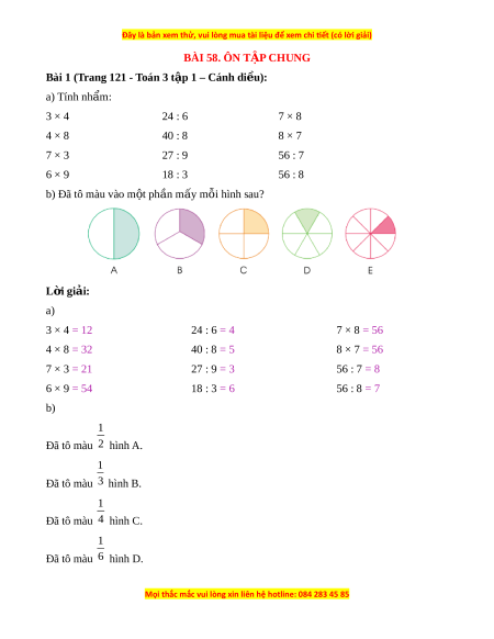 Bài 1 (Trang 121 - Toán 3 t p 1 – C ậ ánh di u) ề : a) Tính nh m ẩ : 3 × 4 24 : 6 7 × 8 4 × 8 40 : 8 8 × 7 7 × 3 27 : 9 56 : 7 6 × 9 18 : 3 56 : 8 b) Đã tô màu vào m t ộ ph n m ầ y m ấ i ỗ hình sau? L i ờ giải: a) 3 × 4 = 12 24 : 6 = 4 7 × 8 = 56 4 × 8 = 32 40 : 8 = 5 8 × 7 = 56 7 × 3 = 21 27 : 9 = 3 56 : 7 = 8 6 × 9 = 54 18 : 3 = 6 56 : 8 = 7 b) 1 Đã tô màu 2 hình A. 1 Đã tô màu 3 hình B. 1 Đã tô màu 4 hình C. 1 Đã tô màu 6 hình D.