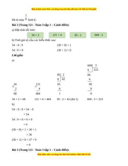 Bài 2 (Trang 121 - Toán 3 t p 1 – C ậ ánh di u) ề : a) Đ t ặ tính r i ồ tính: 34 × 2 121 × 4 85 : 2 669 : 3 b) Tính giá tr c ị a ủ các bi u t ể h c s ứ au: 54 – 0 : 9 (36 + 0) × 1 54 : 9 × 0 (36 + 1) × 0 L i ờ giải: a) 669 3 6 223 85 2 06 8 42 6 34 121 05 09 2 4 4 9 68 484 1 0 34 × 2 = 68 121 × 4 = 484 85 : 2 = 42 (d 1 ư ) 669 : 3 = 223 b) 54 – 0 : 9 = 54 – 0 = 54 54 : 9 × 0 = 6 × 0 = 0 (36 + 0) × 1 = 36 × 1 = 36 (36 + 1) × 0 = 37 × 0 = 0