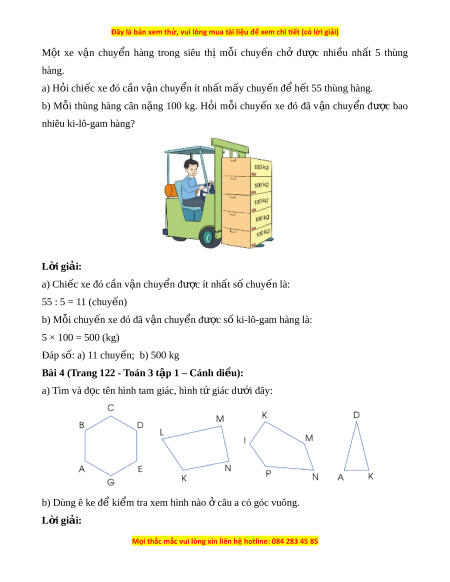 ể hàng trong siêu thị m i ỗ chuy n ế chở đư c ợ nhi u ề nh t ấ 5 thùng hàng. a) H i ỏ chi c ế xe đó c n v ầ n chuy ậ n ể ít nh t ấ m y chuy ấ n đ ế h ể t ế 55 thùng hàng. b) M i ỗ thùng hàng cân n ng ặ 100 kg. H i ỏ m i ỗ chuy n ế xe đó đã v n ậ chuy n ể đư c ợ bao nhiêu ki-lô-gam hàng? L i ờ giải: a) Chi c ế xe đó c n v ầ n chuy ậ n ể đư c í ợ t nh t ấ s chuy ố n l ế à: 55 : 5 = 11 (chuy n ế ) b) Mỗi chuy n xe đó đã ế v n chuy ậ n đ ể ược s ki ố -lô-gam hàng là: 5 × 100 = 500 (kg) Đáp số: a) 11 chuy n; ế b) 500 kg