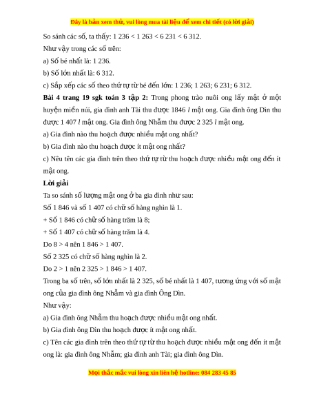 c) Nêu tên các gia đình trên theo th ứ t ự t ừ thu ho ch ạ đư c ợ nhi u ề m t ậ ong đ n ế ít m t ậ ong. L i ờ giải Ta so sánh số lư ng m ợ t ậ ong ba gi ở a đình nh s ư au: