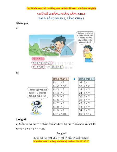 BÀI 9: BẢNG NHÂN 6, B N Ả G CHIA 6 Khám phá a) b) L i ờ giải: a) Mỗi con b r ọ ùa có 6 ch m ấ cánh, 4 con ở b r ọ ùa có s ch ố m ấ cánh l ở à: 6 + 6 + 6 + 6 = 6 × 4 = 24. Bài gi i ả 4 con b r ọ ùa nh v ư y ậ có tất c s ả ố ch m ấ cánh ở là: M i