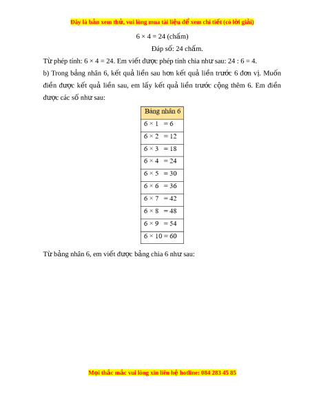 ệ đ xe ể m chi ti t (c ế ó lời gi i ả ) 6 × 4 = 24 (ch m ấ ) Đáp số: 24 ch m ấ . T phép ừ tính: 6 × 4 = 24. Em vi t ế đư c phép t ợ ính chia nh s ư au: 24 : 6 = 4. b) Trong b ng ả nhân 6, k t ế quả li n ề sau h n ơ k t ế quả li n ề trư c ớ 6 đ n ơ v .ị Mu n ố đi n ề đư c ợ k t ế quả li n ề sau, em l y ấ k t ế quả li n ề trư c ớ c ng ộ thêm 6. Em đi n ề đư c các ợ số nh s ư au: T b ừ ng ả nhân 6, em vi t ế đư c ợ b ng chi ả a 6 nh s ư au: M i